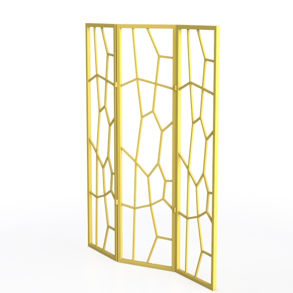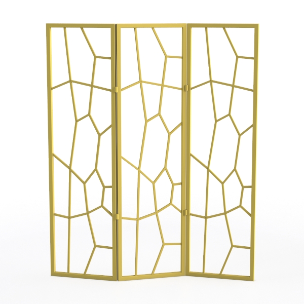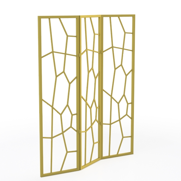 Crafted with a nod to geometric artistry, this room divider takes inspiration from the delicate symmetry of natural crystal formations, where precise angles and open patterns create a sense of lightness and structure. The frame, rendered in a warm gold finish, features a lattice of interlocking angular lines that form a honeycomb-like design—light glides through the open spaces, casting soft, dynamic shadows that add depth to any room. Its tactile allure lies in the smooth, cool touch of the metal, balanced by a sturdy yet lightweight build that makes it easy to maneuver.
