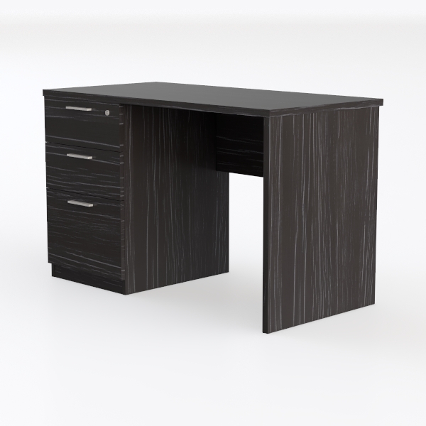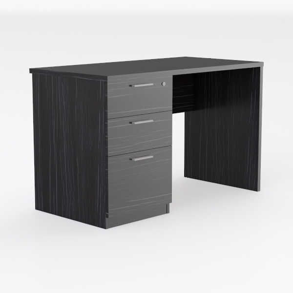 This sleek desk embodies a design philosophy rooted in minimalist practicality, inspired by the modern need for uncluttered, efficient spaces. Its surface features a smooth, matte black finish with subtle wood grain patterns, blending warmth with contemporary cool. The three drawers—two on the left and one on the right—glide open and closed with a seamless, satisfying motion, their metallic handles adding polished contrast to the rich, dark texture of the wood. Visually, it exudes calm, with clean, straight lines and a balanced silhouette that fits effortlessly into various settings.