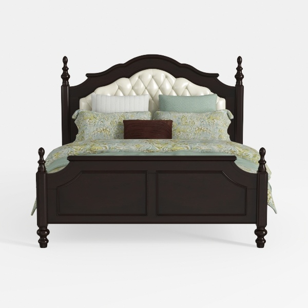 The frame features a rich, dark wood with a smooth, polished finish—its grain visible and inviting, offering a tactile contrast to the soft elements above. At the head, a plush, quilted white leather headboard takes center stage, with intricate diamond stitching adding subtle texture. Light catches the leather’s gentle sheen, while the wood’s deep tone grounds the design, creating an elegant visual balance that feels both opulent and approachable.