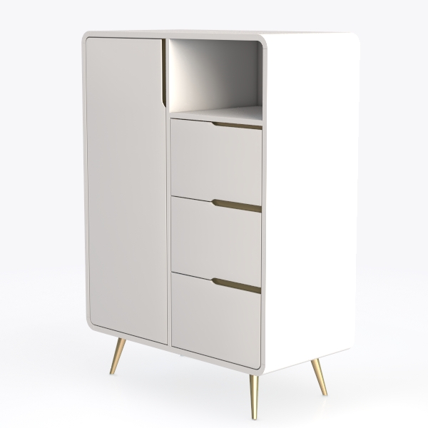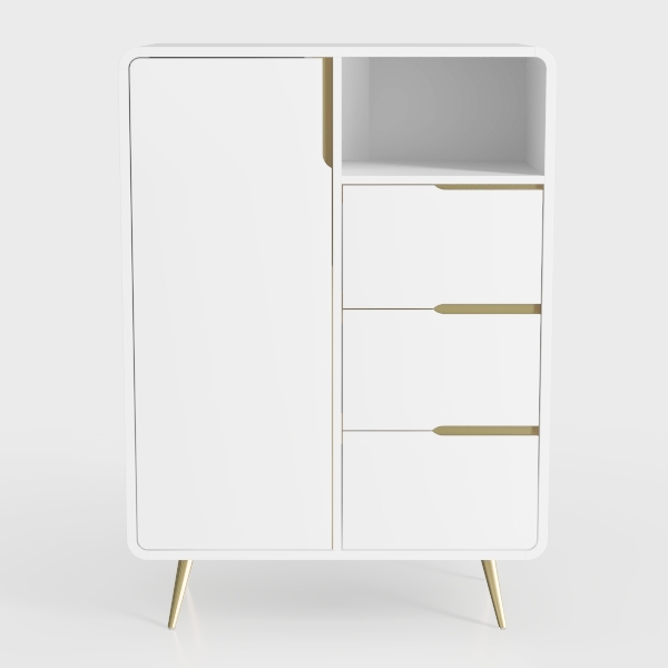 This cabinet embodies the essence of modern minimalism, inspired by the clean, uncluttered aesthetic of Scandinavian design, where every element serves both function and visual harmony. Its pristine white finish, with a smooth, matte texture that feels cool and refined to the touch, contrasts softly with the warm gold of its hardware—sleek, curved handles on the three drawers and delicate, gold-plated legs that lift the piece slightly, creating an illusion of lightness in the room.
