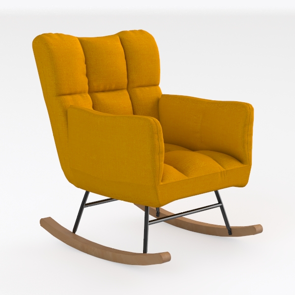 A black metal frame contrasts elegantly with light wood legs, balancing sturdiness and style. It’s a versatile piece, fitting seamlessly into a modern living room paired with neutral sofas and marble side tables, or a cozy bedroom nook with a fluffy rug and a small reading lamp. The gentle rocking motion, supported by the slanted legs, encourages relaxation—perfect for lazy afternoons with a book or quiet evenings to unwind, making it both a functional and visually charming addition to any space.