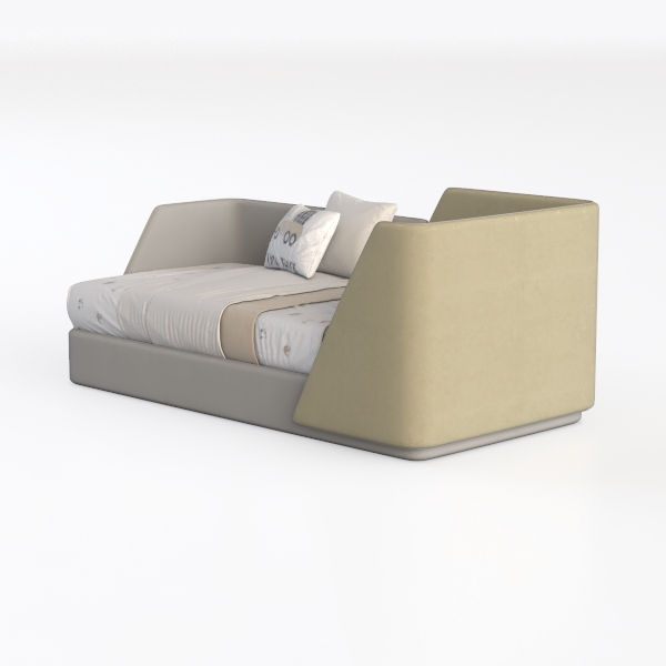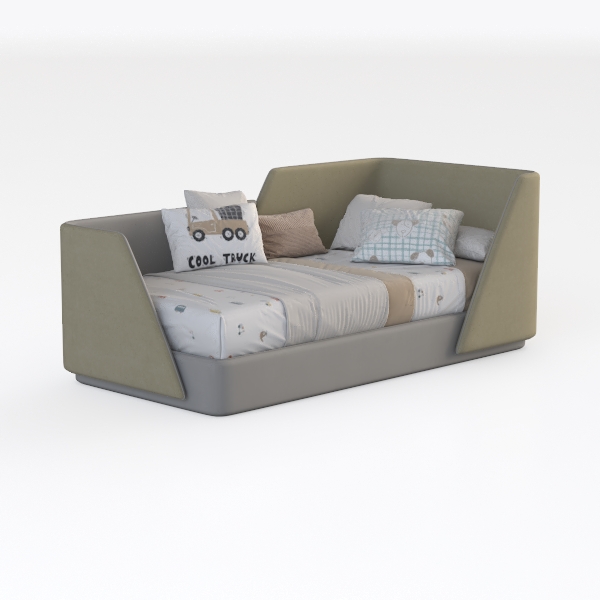 Visually, its design is defined by clean lines and gentle curves. A soft gray base frame grounds the piece, while a warm sage green upholstered headboard adds a touch of earthy charm, creating a calm, inviting palette. The crisp white bedding, dotted with subtle, whimsical patterns, contrasts softly against the muted tones, enhancing the room’s brightness. The upholstered headboard and sides feel surprisingly plush to the touch, offering a cozy, huggable surface that kids will love leaning against, while the smooth, rounded edges ensure safety.