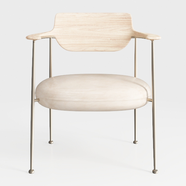 Visually, its neutral palette—pale oak and a warm, off-white upholstery—creates a serene, versatile look. The rounded seat curves gently, catching light to enhance its soft, inviting presence, while the open frame keeps the design uncluttered, perfect for both minimalist and warm-toned spaces.