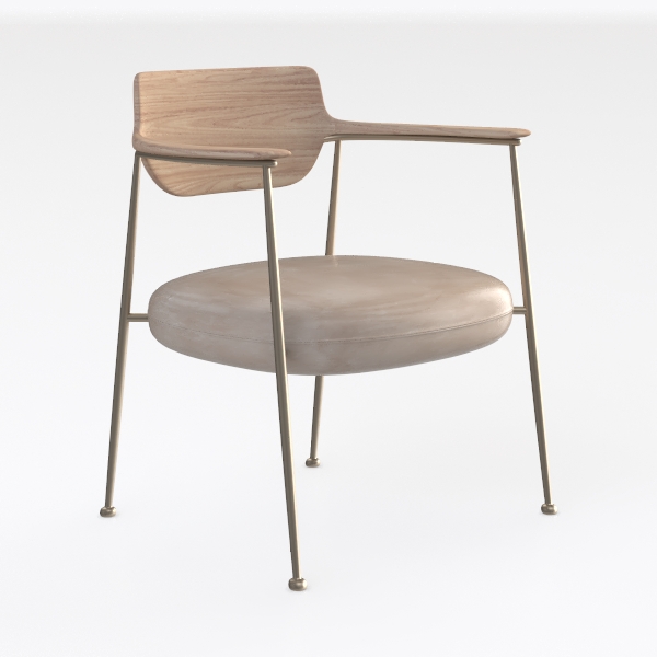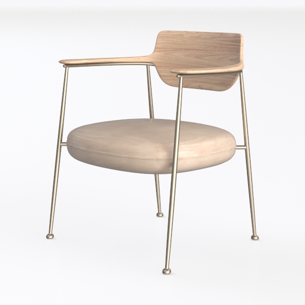 Blending organic warmth with industrial elegance, this chair draws inspiration from mid-century Scandinavian design, balancing natural textures with clean, functional lines. The curved wooden backrest and armrests feature a smooth, sanded oak finish, with soft wood grain visible to add tactile depth, while the thin, tapering metal legs—brushed silver and slightly angled—offer lightness, making the piece feel both grounded and airy.
