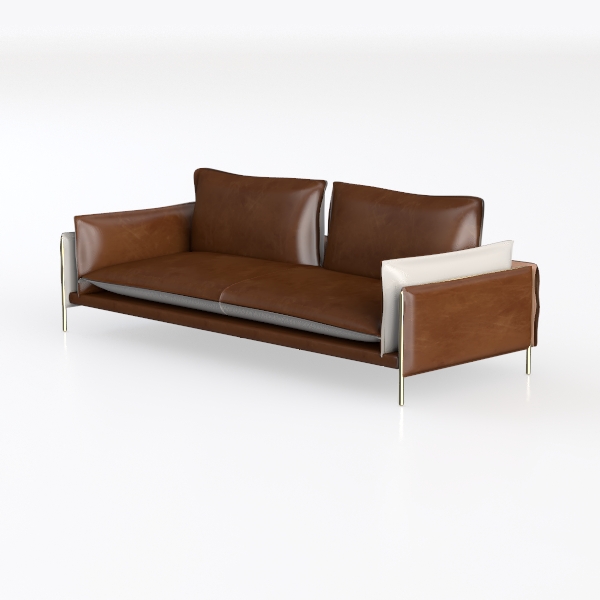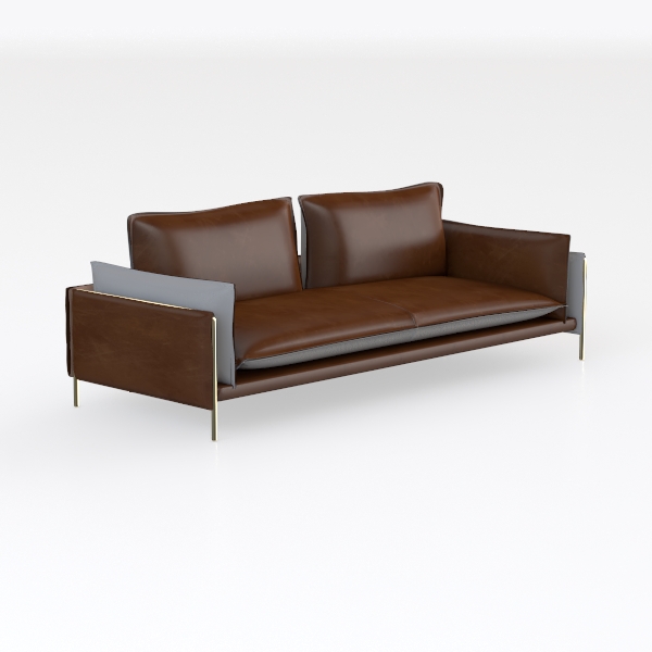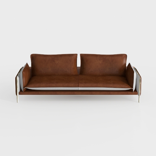 This exquisite sofa draws inspiration from modern minimalism, seamlessly blending aesthetic appeal with comfort. The warm, rich brown leather exudes a sense of luxury, while the sleek lines and metallic accents add a contemporary touch. The sofa's texture invites you to sink into its plush cushions, offering a soft yet supportive feel ideal for relaxation.