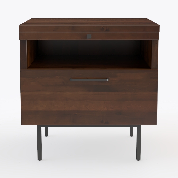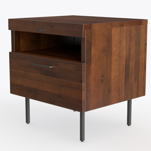 Perfect for a contemporary or minimalist bedroom, this piece effortlessly elevates the space with its understated charm. Pair it with soft, neutral-toned bed linens, a small potted plant on the open shelf, and a sleek metallic desk lamp to create a serene, cohesive atmosphere. The lower drawer, equipped with a slim, black metal handle, provides discreet storage for bedtime essentials like a phone, reading glasses, or a journal, keeping the nightstand clutter-free. The open upper shelf offers a practical spot to display a cherished book or a small decorative object, while its thin, angular black metal legs add a touch of industrial flair, balancing the weighty wooden top and creating a sense of lightness beneath.