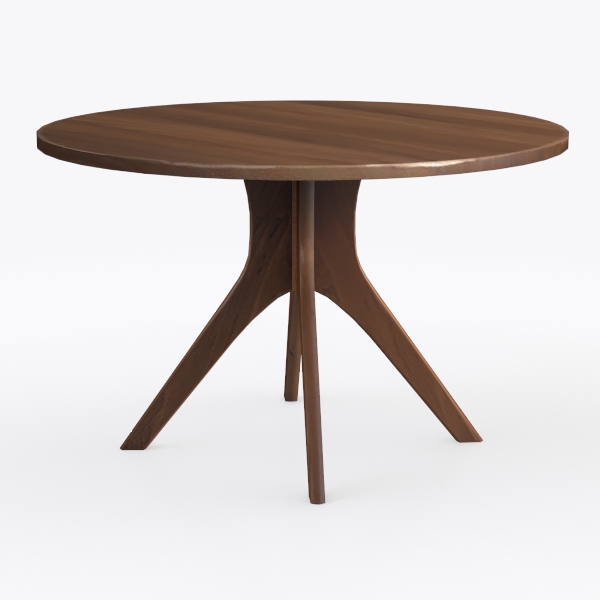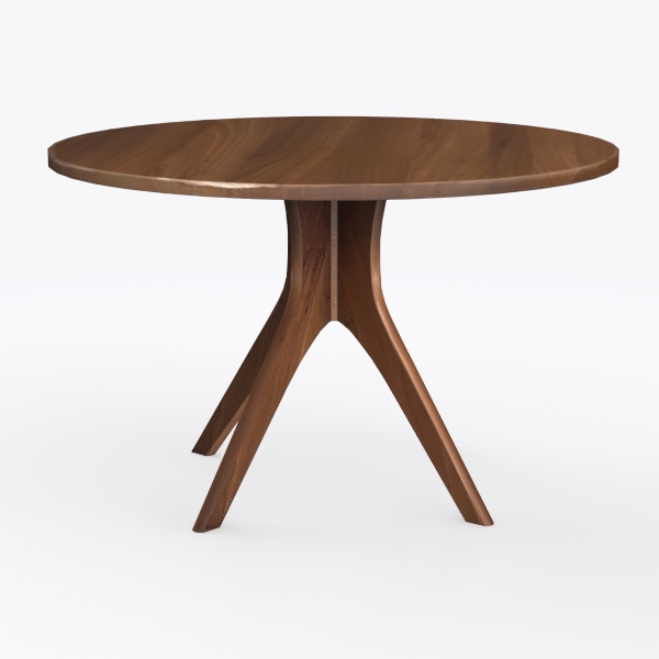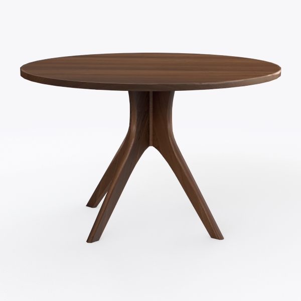 This elegant piece draws inspiration from the harmonious blend of organic curves and geometric precision, reflecting a design philosophy rooted in natural balance and timeless simplicity. Crafted with meticulous attention to detail, its surface showcases rich, warm wood grains that catch the light softly, creating a tactile and visual allure. The smooth, round tabletop feels cool yet inviting to the touch, while the subtly flared, triangular legs—with their tapering ends—provide a striking contrast to the softness of the top, ensuring stability without overwhelming the space.