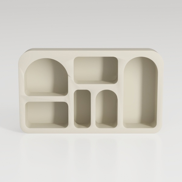 Practical by design, the compartments are thoughtfully sized to handle diverse items: the wide, curved arch accommodates larger objects like a laptop charger, while narrower slots neatly tuck away pens, lipsticks, or small potted plants. Its compact, low-profile form fits effortlessly into tight corners, turning clutter into a curated, visually balanced display that enhances any room’s calm, intentional vibe.