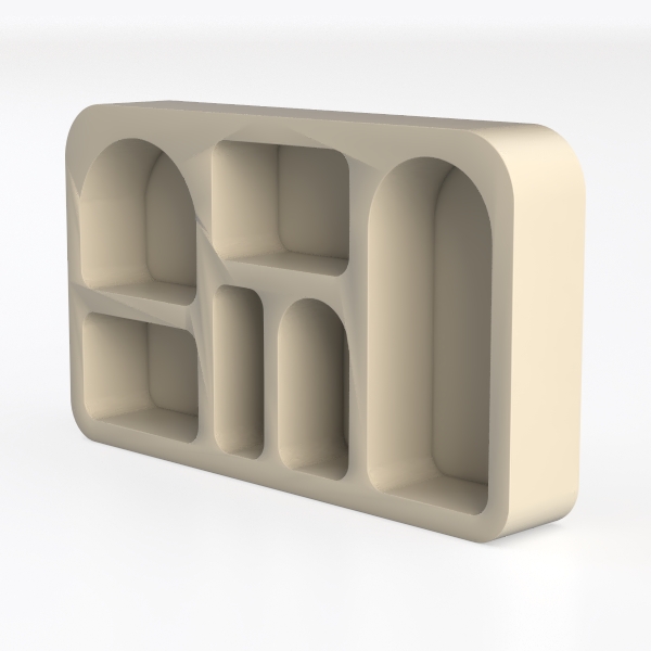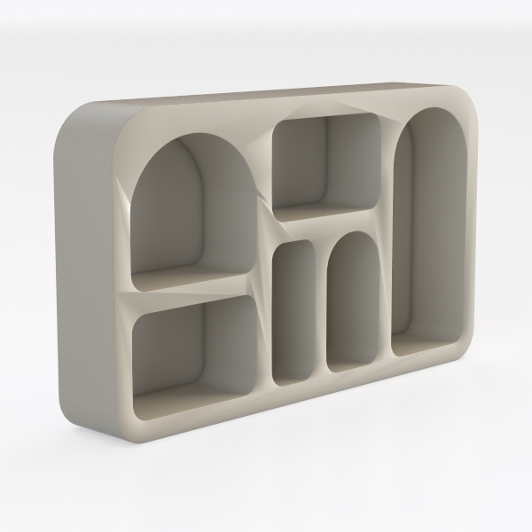 Crafted with a smooth, matte finish—reminiscent of high-quality ceramic or fine concrete—its surface is cool to the touch yet warm in tone, catching ambient light to cast gentle, shifting shadows across its varying compartments. The interplay of shapes—arched top corners, rectangular slots, and oval niches—adds dynamic rhythm, making the unit visually engaging without overwhelming the eye. Its cohesive off-white hue grounds the design, ensuring it complements both warm wood tones and cool metallic accents.