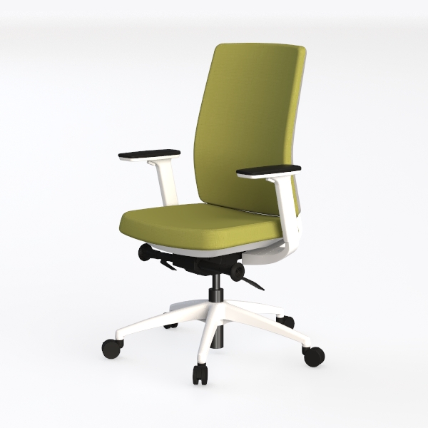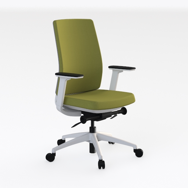 Designed to blend organic serenity with practical daily use, this chair takes cues from the quiet elegance of natural foliage and the efficiency of modern design. The soft, textured green upholstery of the seat and backrest evokes the freshness of emerging leaves, while the smooth, matte white metal frame—with its angular, geometric lines—adds a crisp, contemporary touch. Contrasting black armrests, slightly padded for comfort, and a sleek black base with swiveling casters complete the look, balancing lightness with grounded stability.
