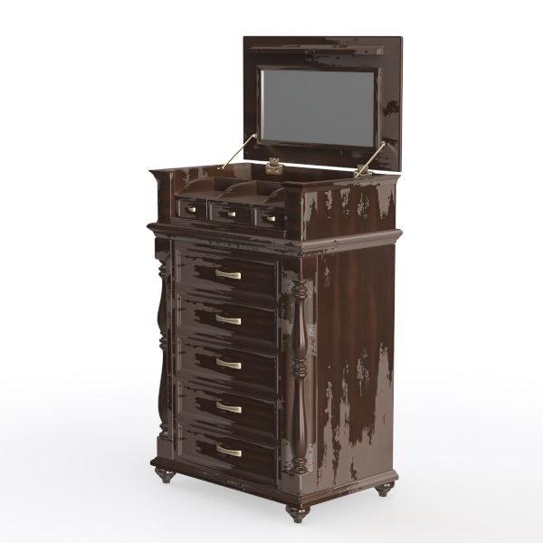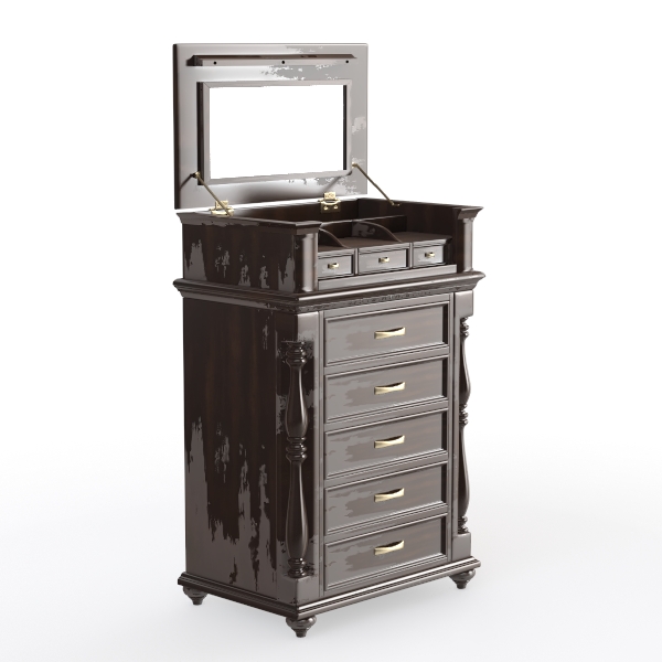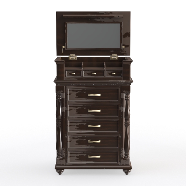 Drawing inspiration from the refined craftsmanship of traditional European furniture, this elegant piece blends timeless design with practical functionality. The deep, warm brown wood finish boasts a glossy, smooth surface that catches light gently, revealing subtle wood grain patterns that add depth and character. Its symmetrical silhouette is enhanced by intricate carved motifs along the sides and front, while the sleek, rectangular mirror on top—hinged for easy access—complements the structured lines, creating a sense of balance and sophistication.