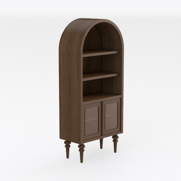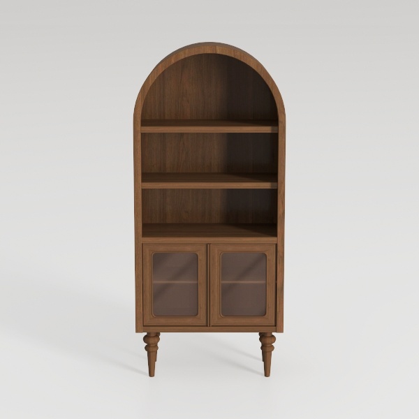 This piece draws inspiration from classic architectural arches, reimagined with a modern minimalist touch. The top, curving gently like a semicircular window, softens the structure, blending traditional warmth with contemporary elegance. Crafted from rich, warm-toned wood, its surface reveals subtle, natural grain patterns that catch light beautifully, creating depth and texture. The two glass-paneled doors, framed in the same wood, add a sense of transparency, allowing glimpses of stored items while keeping dust at bay.