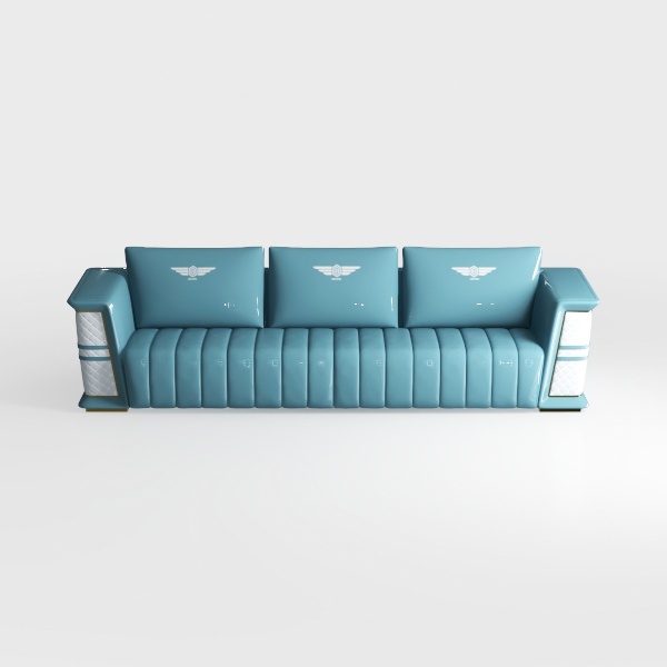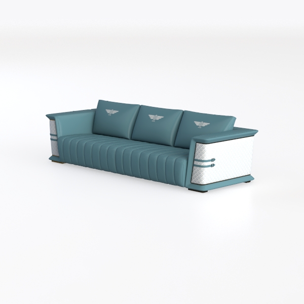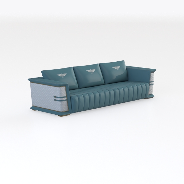 This three-seater sofa merges modern sophistication with understated charm, defined by its soft light blue upholstery that radiates a tranquil, airy vibe—evoking the gentle glow of a clear sky or the calm of a quiet ocean. Its design draws inspiration from a thoughtful fusion of natural serenity and geometric precision: the subtle white wing emblems on each靠垫 (cushion) add a delicate, uplifting touch, while the vertical ribbing on the seat and the crisp, structured armrests with gray diamond-patterned inserts introduce intentional texture, balancing minimalist elegance with tactile interest.