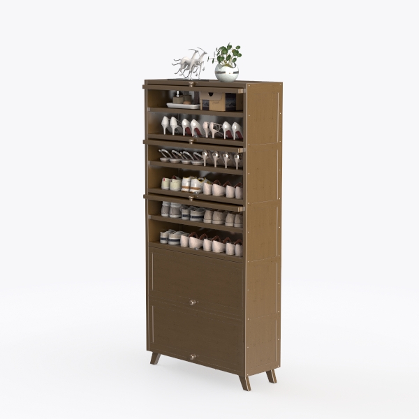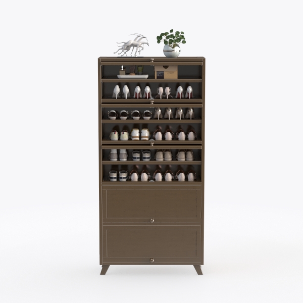 This elegant shoe storage unit draws inspiration from the desire to merge practical organization with refined home aesthetics, embodying a blend of minimalism and warmth. Crafted from rich, matte-finished wood with clean, straight lines, its surface feels smooth and cool to the touch, with subtle wood grain details adding depth without overwhelming. The glass-paneled shelves allow a glimpse of neatly arranged shoes, creating an open, airy feel, while the warm brown hue complements both light and dark room decors.