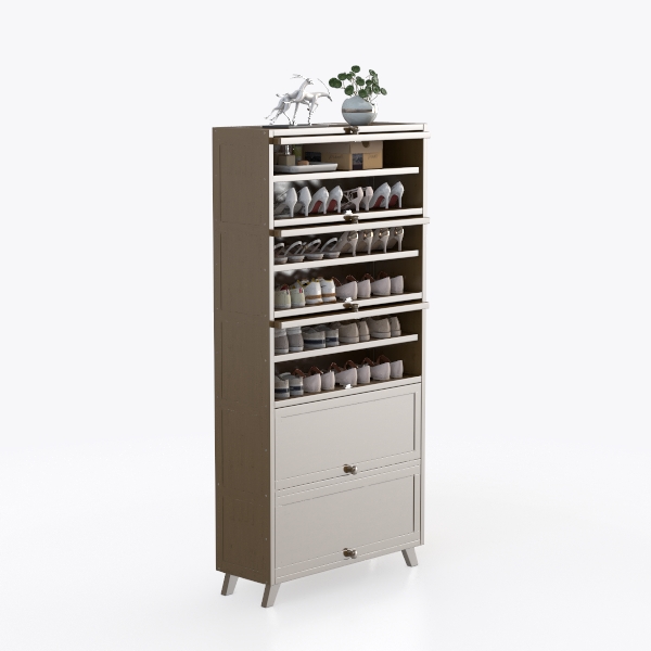Perfect for modern minimalist, Scandinavian, or even soft industrial spaces, it pairs beautifully with linen cushions, woven rugs, or marble/ceramic decor pieces on top—metallic accents like brass drawer pulls enhance its understated luxury. Functionality is key: multi-tiered open shelves easily fit heels, sneakers, and loafers, while the two lower closed drawers offer hidden storage for shoe boxes, cleaning tools, or small accessories. This unit doesn’t just store shoes; it transforms a cluttered corner into a stylish, organized focal point, balancing utility and visual appeal seamlessly.