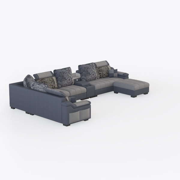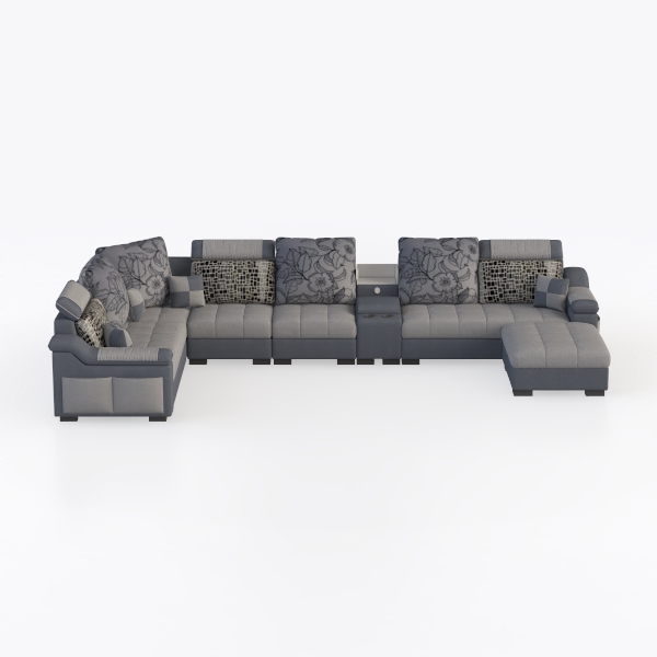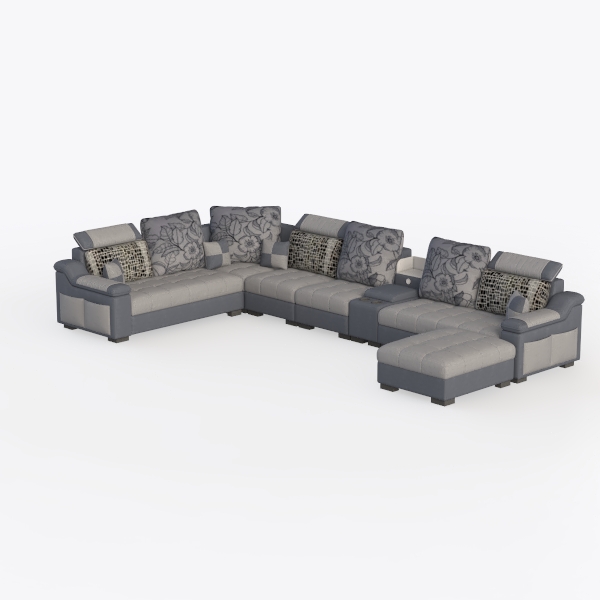This spacious sectional sofa draws inspiration from contemporary design trends, seamlessly blending comfort and style. With its plush upholstery and intricate floral-patterned throw pillows, it offers a visually striking yet inviting aesthetic. The combination of soft gray tones and subtle textures creates a warm and sophisticated ambiance that is ideal for modern living spaces.