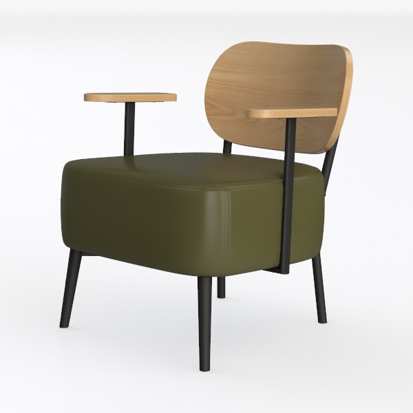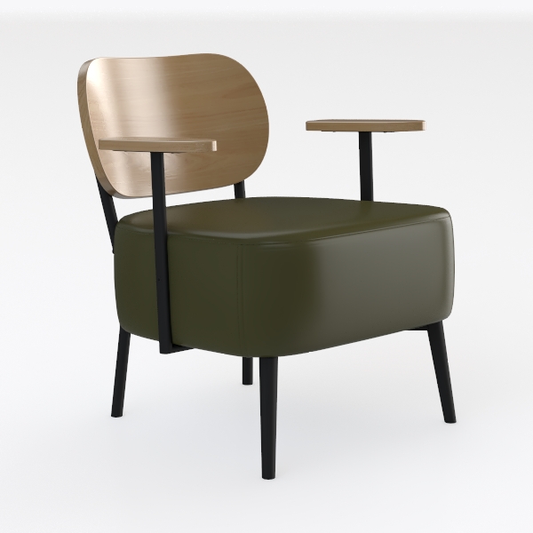 Rooted in a harmonious blend of mid-century modern minimalism and organic warmth, this piece draws inspiration from the fluid, sculptural forms of 20th-century design and the tactile richness of natural materials. The curved wooden backrest, with its soft, visible grain, evokes the gentle undulations of natural landscapes, while its smooth, polished surface offers a warm, inviting touch. The deep, olive-green upholstered seat, crafted from high-quality, slightly textured leather-like material, feels plush and resilient under pressure, inviting extended relaxation. Contrasting the organic softness, the black metal legs and armrests feature clean, angular lines, adding a sleek, contemporary edge that balances the piece’s overall warmth.