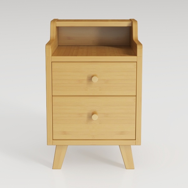 Two roomy drawers offer practical storage for bedtime items like a phone, reading glasses, or a notepad, with smooth-gliding mechanisms ensuring easy use. The slightly angled, tapered legs provide stability while keeping the piece feeling light and open, making it a versatile choice that fits seamlessly into small or large bedrooms alike.