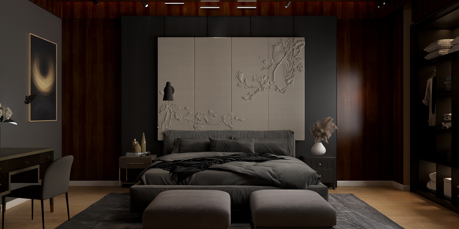 This wardrobe design draws inspiration from the need to blend aesthetic elegance with daily practicality, merging clean lines and functional organization into a cohesive piece. Crafted with a smooth, matte black finish, its surfaces feel cool to the touch yet warm to the eye, while the deep, rich tone of the wood grain adds subtle texture without overwhelming the space. Built-in LED strips cast a soft, diffused glow along the shelves, illuminating neatly folded linens and garments below, creating a serene, inviting atmosphere that transforms the act of getting dressed into a calming ritual.