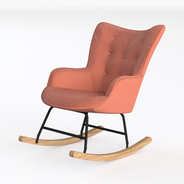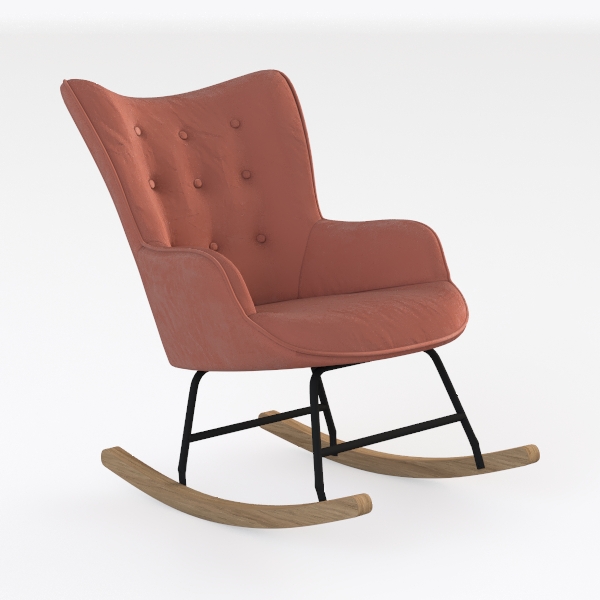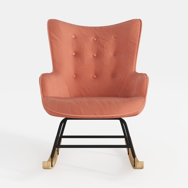 Crafted with a soft, velvety upholstery in a warm terracotta hue, the chair feels surprisingly tactile—plush yet not overly heavy, inviting you to sink in and linger. The texture of the fabric catches light subtly, adding depth to its warm color, while the tufted buttons on the backrest create a classic, understated detail that elevates its visual appeal. The black metal frame, with its slim, angular legs, contrasts sleekly against the chair’s organic shape, while the light oak wooden rockers add a natural, grounding element, balancing the design’s modern edge.