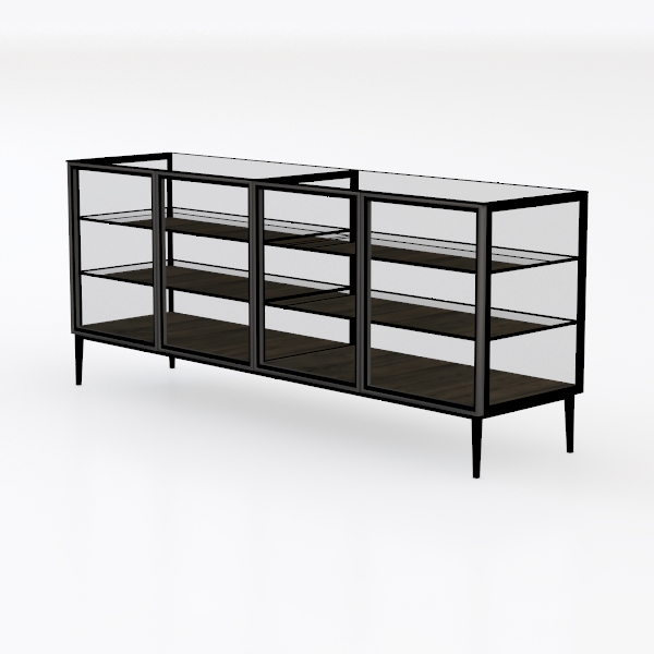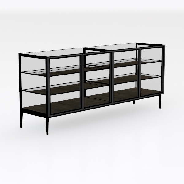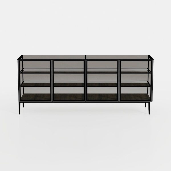 This refined piece draws design inspiration from the fusion of industrial simplicity and organic warmth, balancing bold structural lines with tactile softness. The frame, forged from matte black metal, features sharp, unadorned edges that radiate modern minimalism, while the horizontal bars create a sense of lightness, avoiding the bulk of closed cabinets. The shelves, lined with rich, dark wood, reveal subtle grain patterns, infusing natural texture and a gentle contrast to the cool metal frame, making the entire piece feel grounded yet airy.
