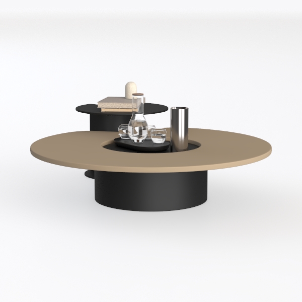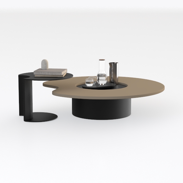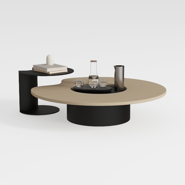 Designed with organic geometric harmony, this piece blends soft curves and bold contrasts. The sleek matte beige top contrasts with the smooth black base, creating a calm, modern vibe. Ideal for minimalist or Scandinavian living rooms, it pairs beautifully with marble accents and metallic decor. A curved side shelf adds practical storage, while the central indentation holds drinks and decor, balancing style and utility seamlessly.
