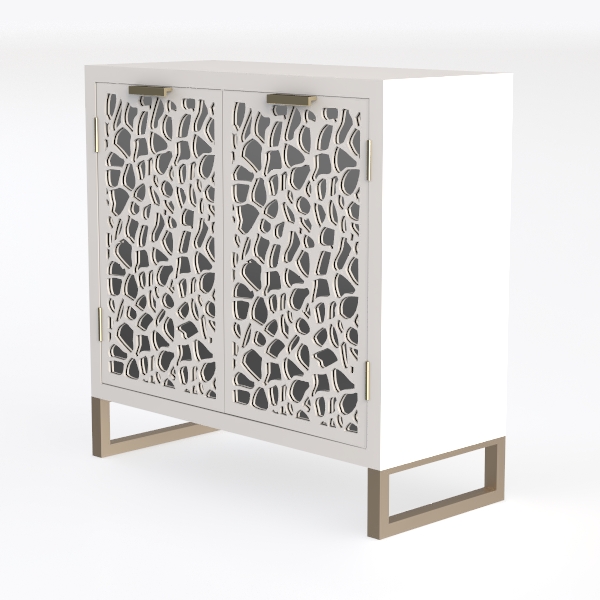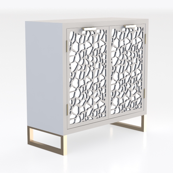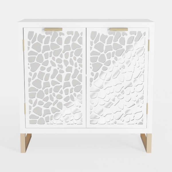 Inspired by natural stone textures, this cabinet features smooth white surfaces with intricate cut-out patterns, creating a light, airy feel. Its gold metal handles and legs add a touch of elegance, making it ideal for modern minimalist or contemporary spaces—perfect for a living room, dining area, or entryway. With two doors, it offers ample storage, balancing style and functionality.