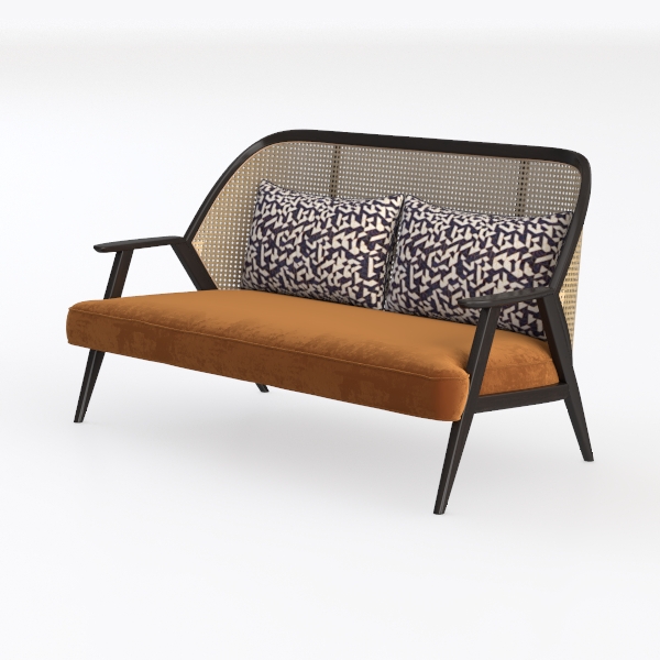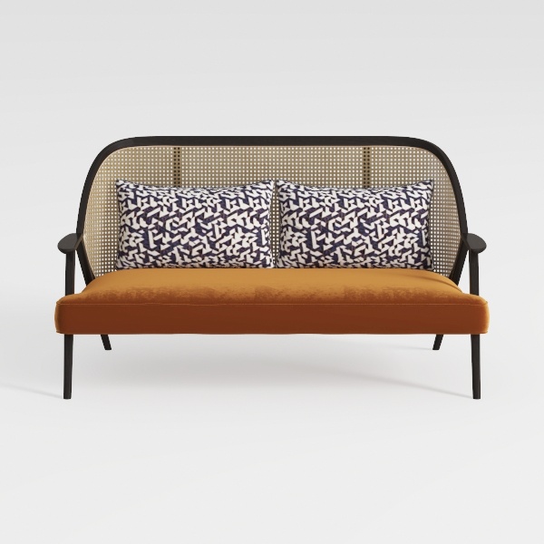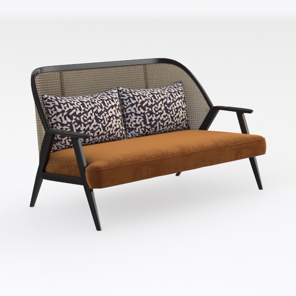 Blending mid-century modern warmth with organic artisanal touches, this sofa takes cues from natural weaving traditions and streamlined industrial design. Its curved silhouette feels both nostalgic and fresh, with a black metal frame that tapers gently to slender, balanced legs—grounding the piece in quiet stability.