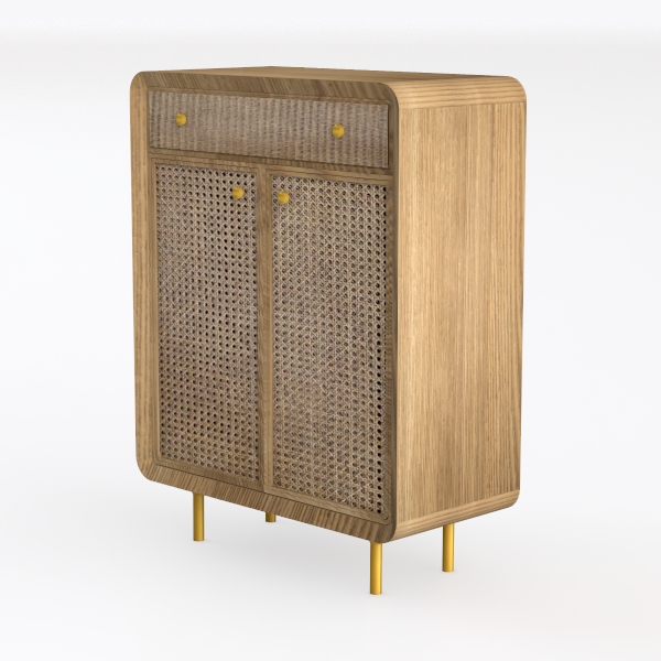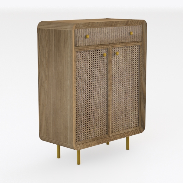 Drawing inspiration from natural craftsmanship, this cabinet blends warm wood with intricate rattan weave, offering a textural, breathable feel. Golden metal handles add subtle elegance, while its light, airy design suits bohemian or modern rustic spaces, pairing well with linen sofas and potted greenery. A top drawer and woven doors provide ample storage for daily essentials.