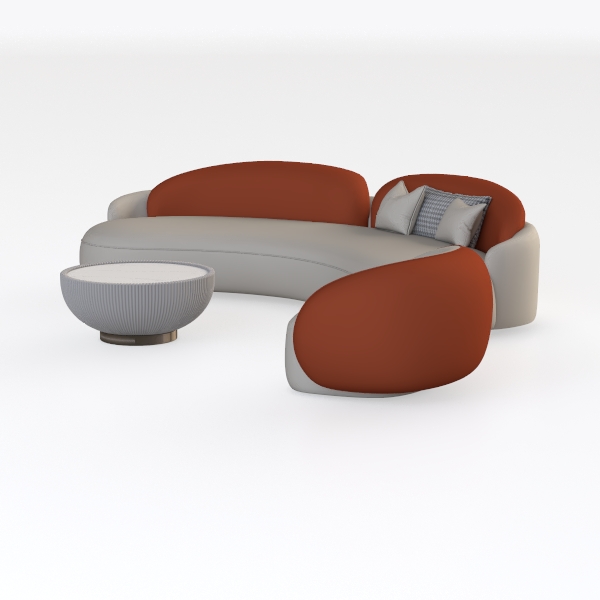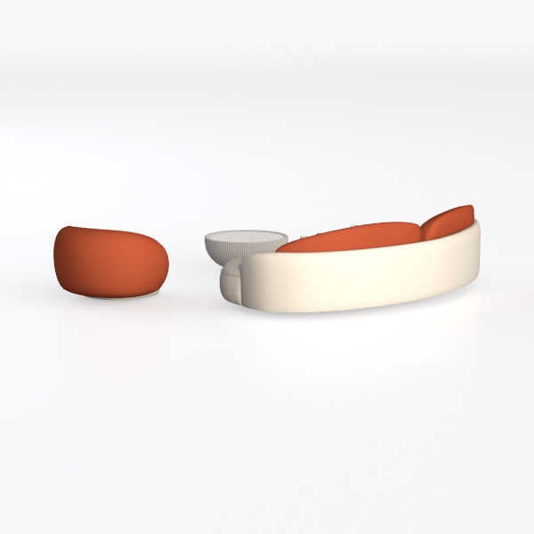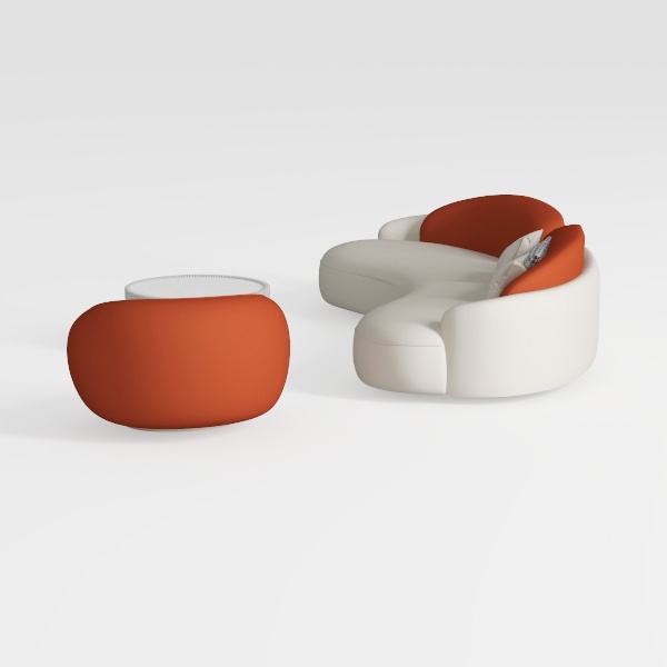 Drawing inspiration from soft, organic curves found in nature—think smooth river stones or flowing cloud formations—the collection blends gentle, rounded silhouettes with striking color contrast. The main sofa features a creamy white upholstery with a matte, velvety texture that invites tactile comfort, while vibrant tangerine-orange cushions and a matching ottoman add a warm, energetic pop. The ottoman, with its bulbous shape and smooth, slightly firm surface, offers both extra seating and a handy footrest, while the accompanying coffee table, with its sleek transparent top and thin metallic base, balances the softness with a touch of lightness.