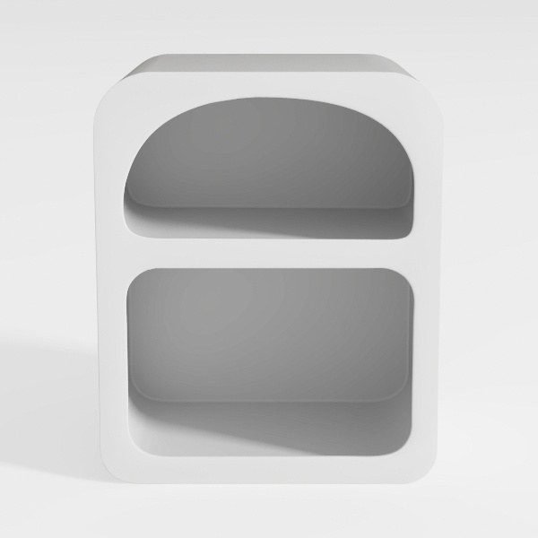 Inspired by architectural archways, blending modern minimalism with subtle organic curves, this white shelving unit features a sleek, matte surface. Soft shadows enhance its geometric precision, creating calm. Ideal for modern, Scandinavian, or minimalist spaces, it has two distinct compartments—arched top and rectangular base—for flexible storage of decor or essentials.