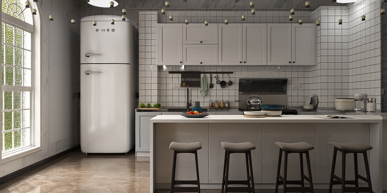 Inspired by minimalist Scandinavian design, this home bar blends clean lines and functional space. Sleek white surfaces offer a cool, smooth touch; dark wooden legs and light gray stools add warm contrast. The bright, uncluttered layout creates an airy, modern vibe, ideal for gatherings or casual meals. Perfect for open kitchens or lofts, pair with marble accents and metallic fixtures for a contemporary look. Ample counter space fits prep work or dining, with an integrated sink boosting practicality.