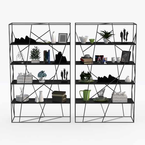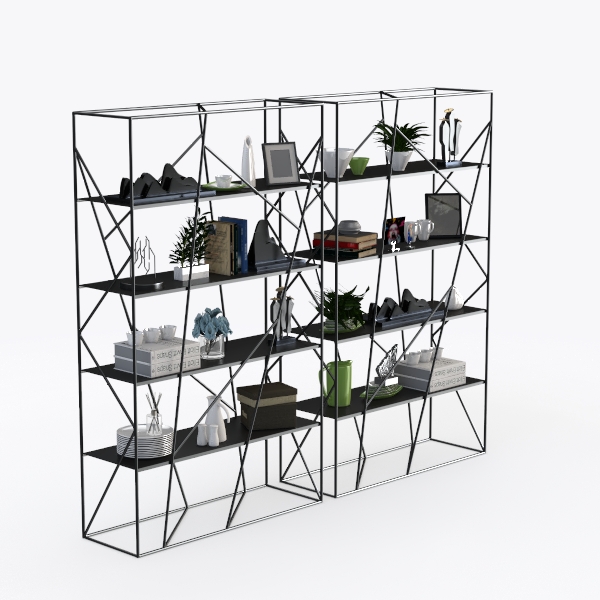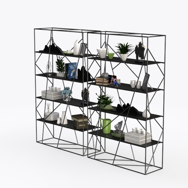 Inspired by geometric architecture, this home display unit features a sleek black metal frame with a mix of smooth and textured surfaces, blending industrial edge and warm homey touches. Ideal for modern minimalist or industrial living rooms, it showcases books, potted plants, and decor to add character. Spacious open shelves offer ample display/storage, with a lightweight yet sturdy design fitting seamlessly into any layout.