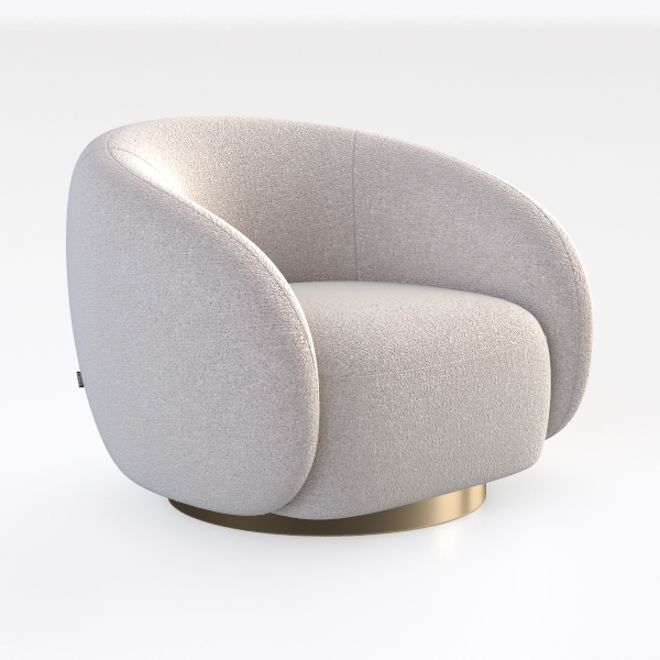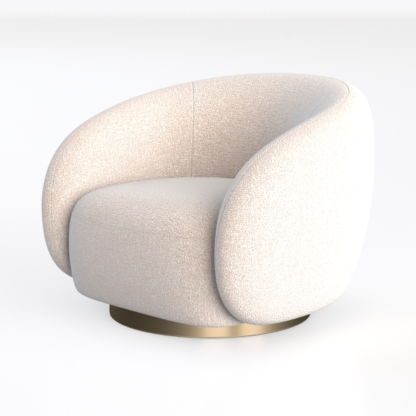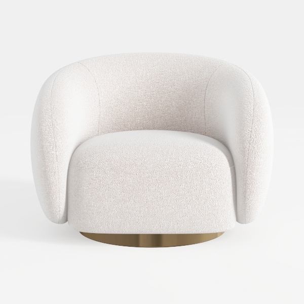 Inspired by the fluid lines of organic shapes and mid-century modern design, this armchair merges soft curves with understated luxury. Its plush, off-white bouclé fabric catches light gently, offering a warm, tactile texture that invites touch—soft yet substantial, like sinking into a cloud of cozy elegance. The rounded silhouette, from the wide, gently sloping armrests to the generously padded seat, wraps the body in comfort, while the smooth, matte golden metal base grounds it with a subtle opulence, balancing lightness and stability.
