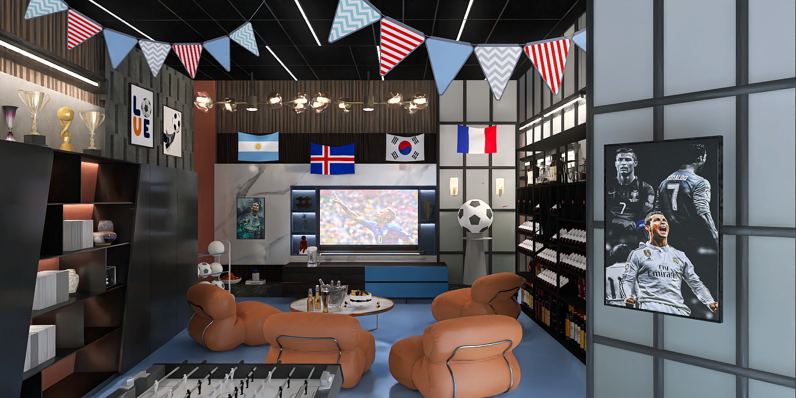 Inspired by minimalist Scandinavian design, blending organic textures with geometric precision, this furniture piece features smooth matte blue panels contrasting rich wood grain surfaces. Its tactile mix of warmth and coolness, paired with clean lines, creates a balanced look. Ideal for a modern living room, it pairs with neutral sofas and greenery, offering spacious storage with hidden drawers and closed compartments for organized living.