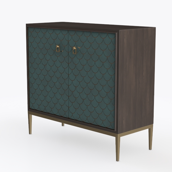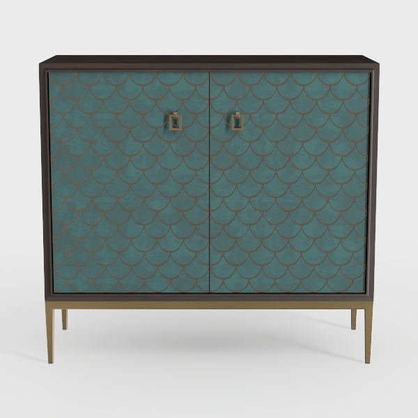 Inspired by ocean scales, the cabinet’s front features overlapping, wave-like teal patterns. Smooth yet subtly textured, it contrasts beautifully with deep brown edges and gold legs, adding warm, elegant depth. Perfect for modern-luxury living rooms or dining areas, pair with marble side tables and brass fixtures. Double doors offer ample storage, while slim gold legs keep it light and stable, blending style with practicality.