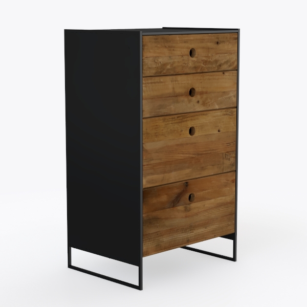 Crafted from reclaimed wood and black metal, this cabinet blends organic warmth with industrial edge, inspired by nature's raw beauty and functional minimalism. The wood's visible grain and varied honey-brown tones create a tactile, earthy feel, while the matte finish softens the sharp metal frame. Ideal for a cozy Scandinavian living room or loft bedroom, it pairs with marble accents and woven textiles. Spacious drawers with smooth pulls offer ample storage, their sturdy metal legs ensuring stability and modern flair.