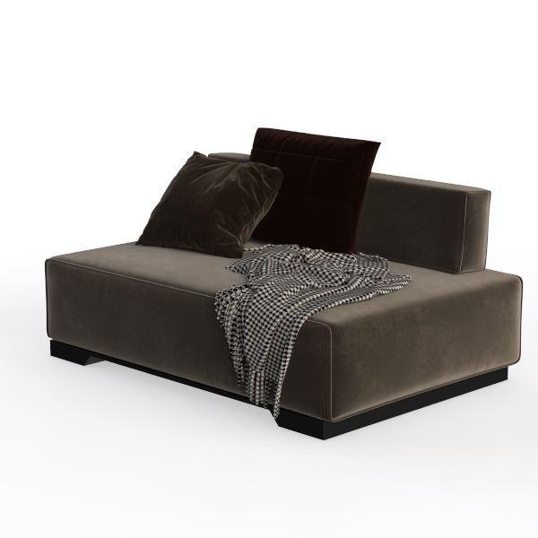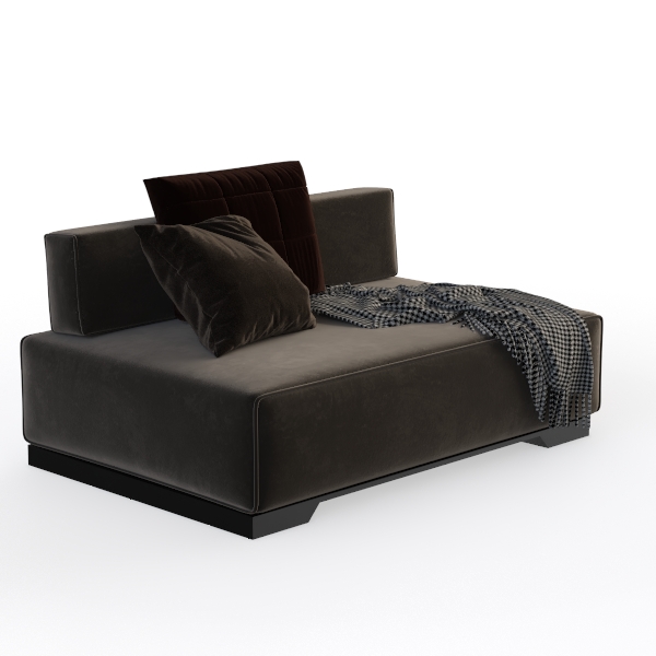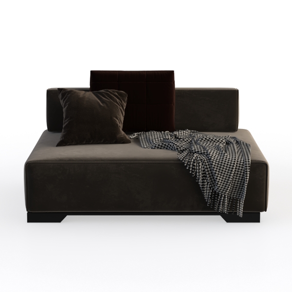 Visually, the deep charcoal upholstery catches the light subtly, revealing a rich, velvety texture that feels inviting to the touch—soft yet substantial, like a well-worn luxury fabric. Complementing this, a plush brown velvet cushion adds depth, while a checkered knit throw with muted tones drapes casually, introducing subtle pattern without overwhelming the space. The low-profile silhouette, paired with slim, matte black legs, creates a sense of lightness, making it feel both grounded and airy.
