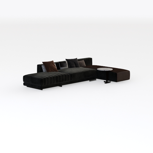 This L-shaped sofa merges modern minimalism with tactile allure, inspired by the clean geometry of contemporary interior design and the organic flow of open living spaces. Its plush, velvety fabric in deep black wraps around structured vertical channels, creating a subtle texture that catches light softly, while the L-shape itself embodies adaptability, making it a natural focal point in any room. Accents of warm brown throw pillows and a marble-topped side table add depth, balancing the cool neutral base with rich, earthy tones that feel both intentional and inviting.