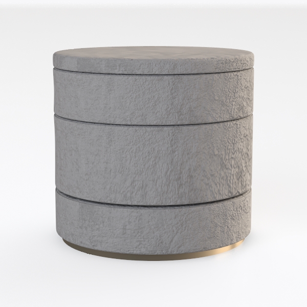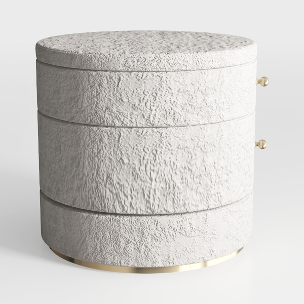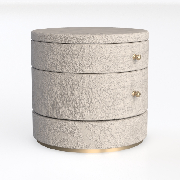 Inspired by natural stone's organic texture, this round three-drawer cabinet has a textured, matte surface with subtle granularity. Its clean silhouette blends modern minimalism with warm, earthy charm, ideal for modern-luxury bedrooms or living rooms, complementing marble accents and metallic finishes. Three-tiered drawers offer ample storage, while gold-toned base and handles add subtle opulence, balancing simplicity with refined style.