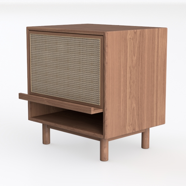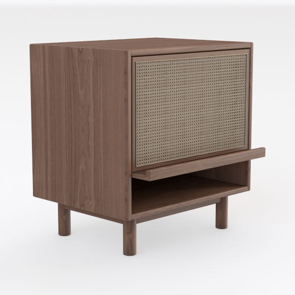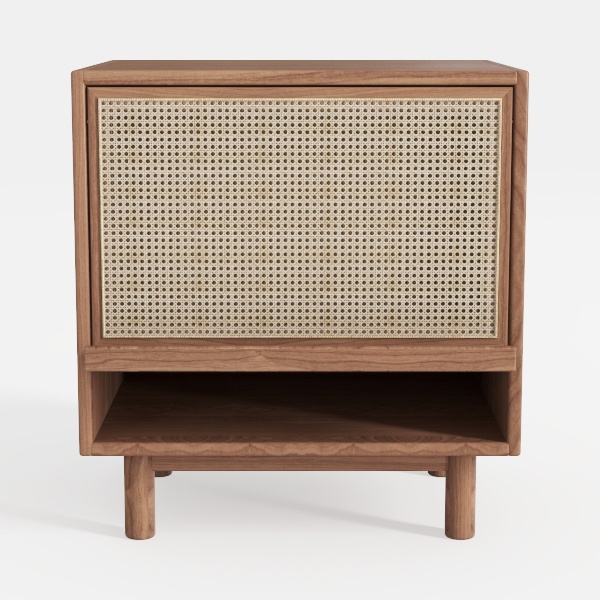 Inspired by natural simplicity, this wooden nightstand blends warm oak with a textured rattan front—smooth to touch, visually grounding with soft shadows and clean lines. Ideal for a serene bedroom, it pairs beautifully with linen bedding and potted plants, elevating a Scandi-Japanese vibe. The lower open shelf offers handy storage for bedtime essentials like a book or lamp.