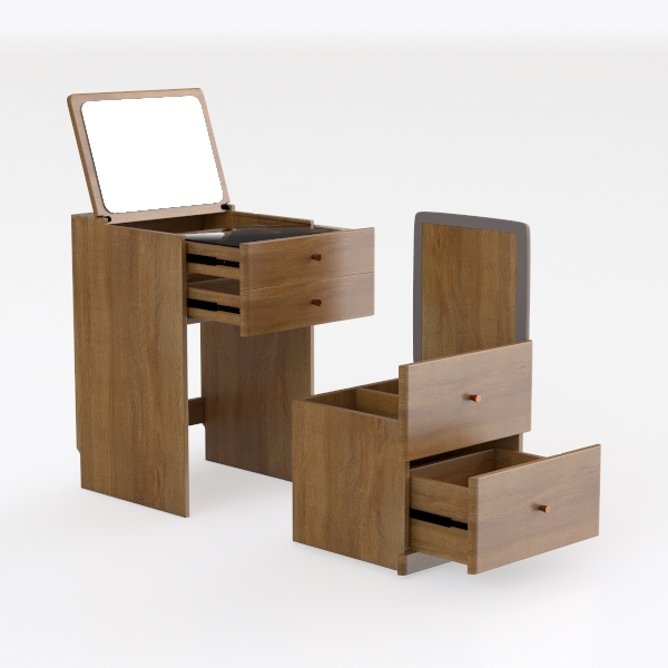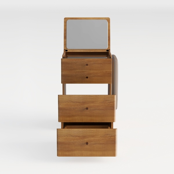 Inspired by natural wood’s organic charm, this vanity blends warmth with minimalist design. Its smooth, grainy surface offers tactile comfort, while clean lines and a compact frame create a serene, clutter-free look. Perfect for modern, Scandinavian, or Japanese bedrooms, it features three spacious drawers for storage and a built-in mirror, blending style and practicality seamlessly.