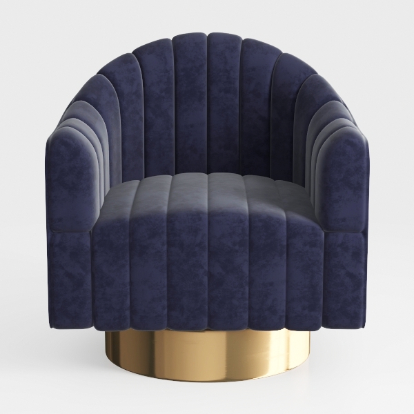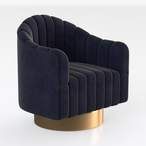 Visually, the chair balances opulence with restraint: the deep indigo hue of the velvet contrasts beautifully with the warm, polished gold base, a metallic accent that adds a touch of glamour without overwhelming the design. The base itself, with its smooth, cylindrical form, grounds the piece, while the curved armrests offer subtle, supportive contours, making it both visually appealing and supremely comfortable.