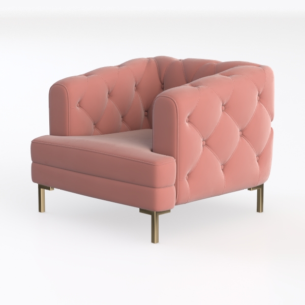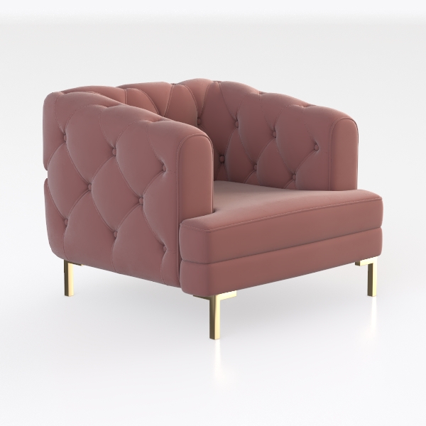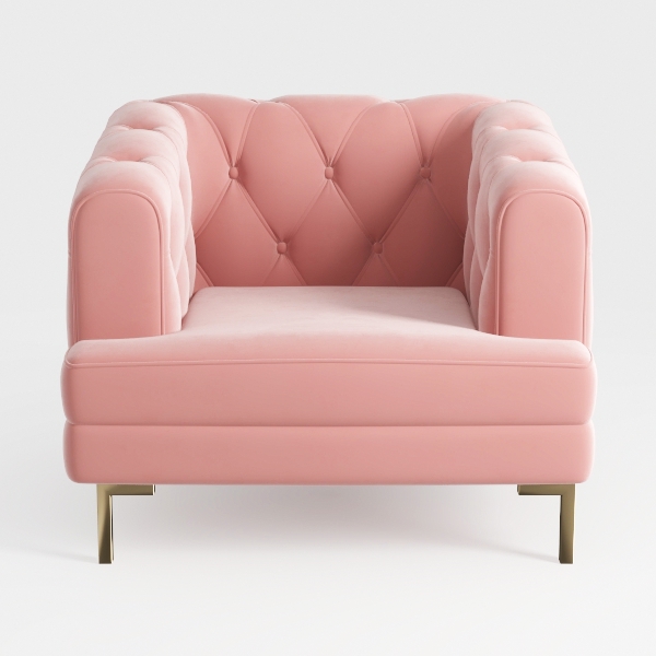 This armchair draws inspiration from the timeless charm of vintage tufted furniture while embracing contemporary minimalism, blending classic design elements with modern sensibilities. The soft, plush velvet upholstery feels luxuriously smooth to the touch, its warm blush hue infusing the space with a gentle, inviting glow. The diamond-tufted backrest adds subtle texture, creating depth that catches the light beautifully, while the sleek gold-tone legs provide a striking contrast, lifting the piece to feel both substantial and elegant.