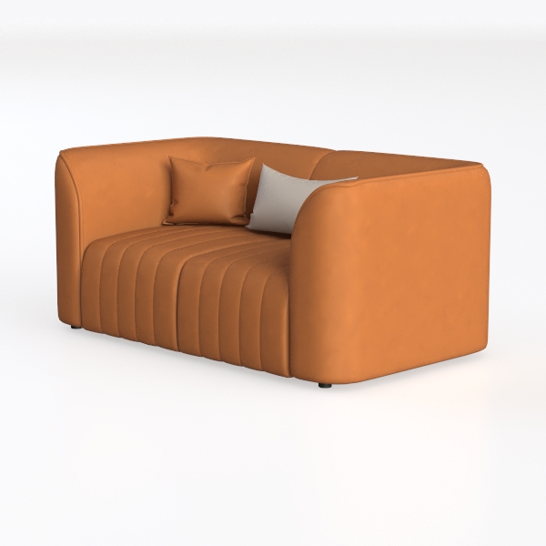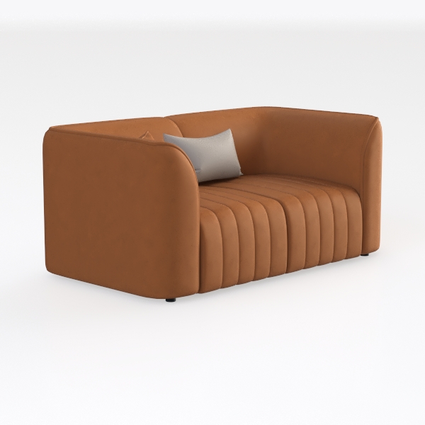 This sofa radiates a harmonious blend of mid-century charm and modern warmth, taking cues from the soft curves and earthy palettes of 1970s design reimagined for today’s spaces. Its rich terracotta upholstery, with a subtle, velvety texture, feels luxurious to the touch—warm and inviting, like sinking into a well-loved blanket. The vertical channeling along the seat adds gentle dimension, while the rounded armrests and flowing backrest create a soft, cocoon-like shape, balancing structure with comfort.