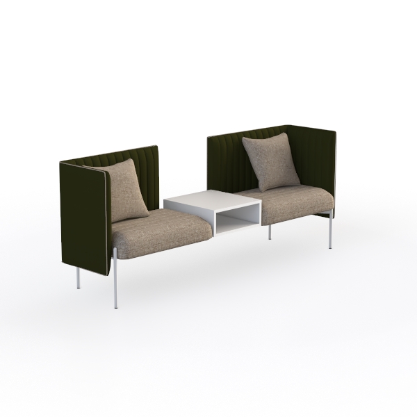 The wide, curved arms provide a natural resting spot for arms or crossed legs, while the central table tucks neatly between the seats, ideal for placing drinks, remotes, or a small plant. The slender white metal legs keep the design light and airy, ensuring it fits seamlessly into both small and large spaces without overwhelming the room’s proportions.