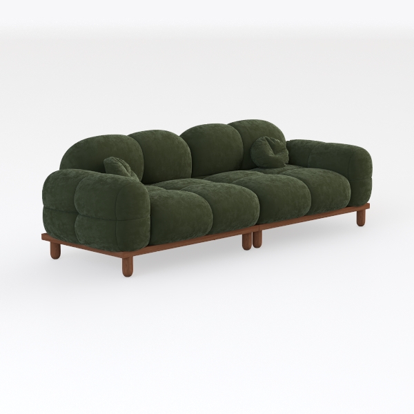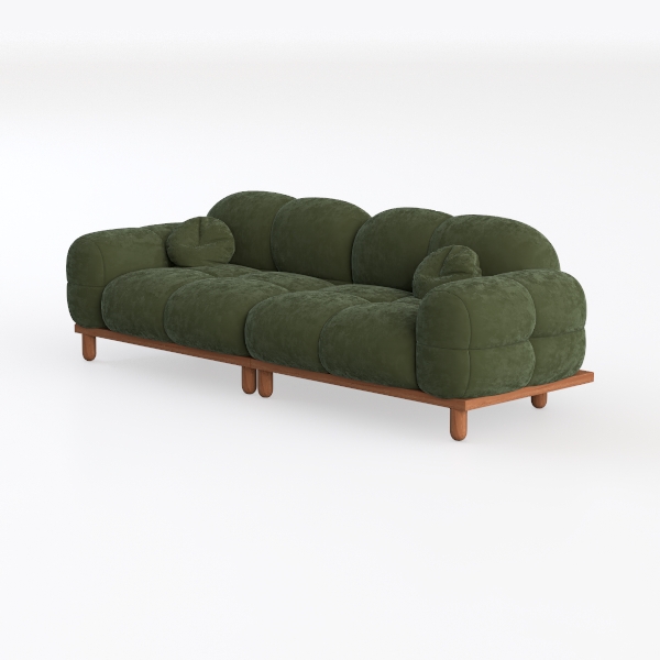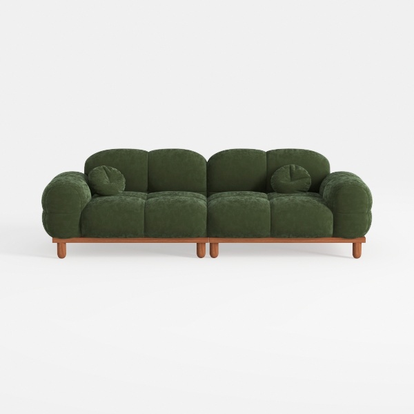 Inspired by the organic softness of natural forms, this sofa merges the lushness of deep forest green with gentle, rounded silhouettes, evoking a sense of calm and warmth. Its fabric feels like a cloud against the skin—plush, velvety, and inviting—while the soft curves of the backrest and armrests create a visually soothing, almost sculptural silhouette. The warm oak legs add a natural, earthy contrast, grounding the piece and enhancing its organic charm, making it a focal point that feels both modern and timeless.