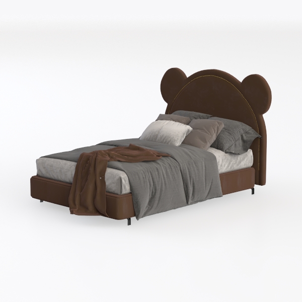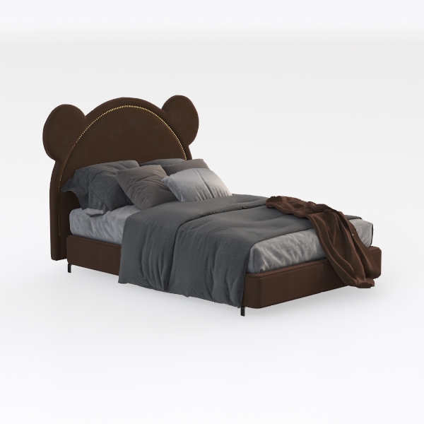 Inspired by playful animal motifs, this bed features an endearing bear ear headboard in rich brown velvet. The soft texture and gold nailhead trim add warmth and intricate charm. Ideal for a cozy kids' room or whimsical bedroom, it pairs beautifully with soft pastels and wooden furniture. Plush upholstery ensures superior comfort, with a sturdy base offering reliable support.