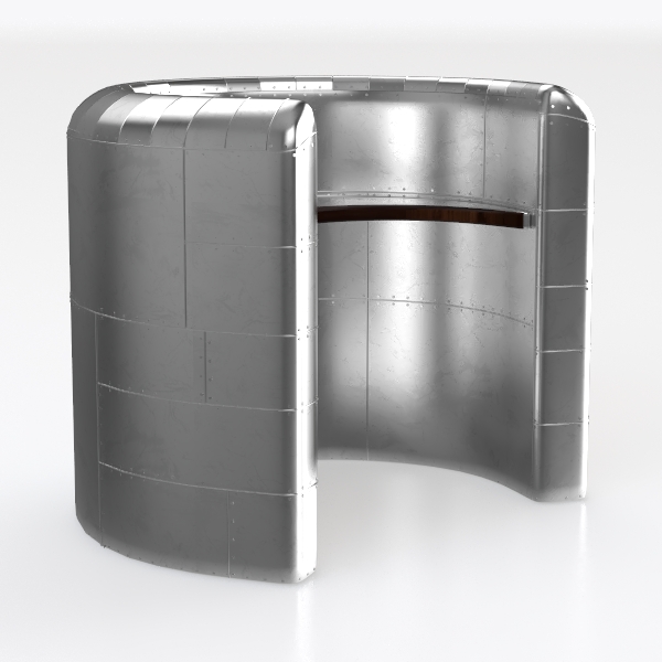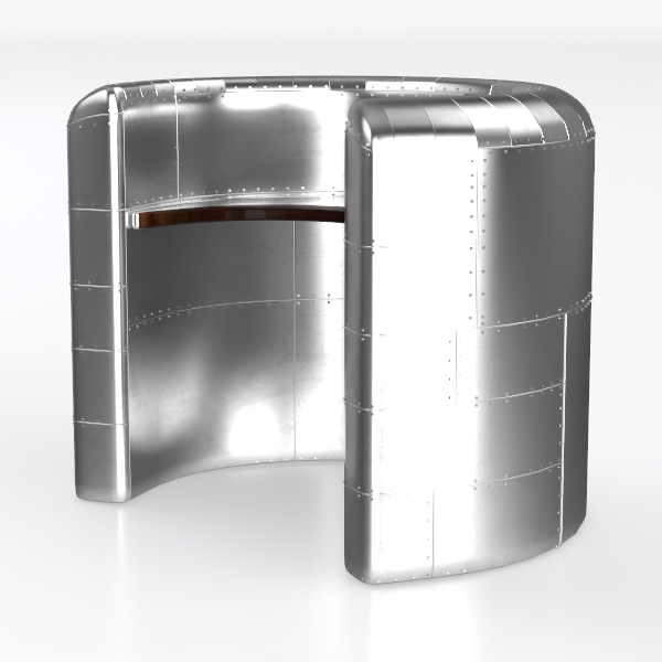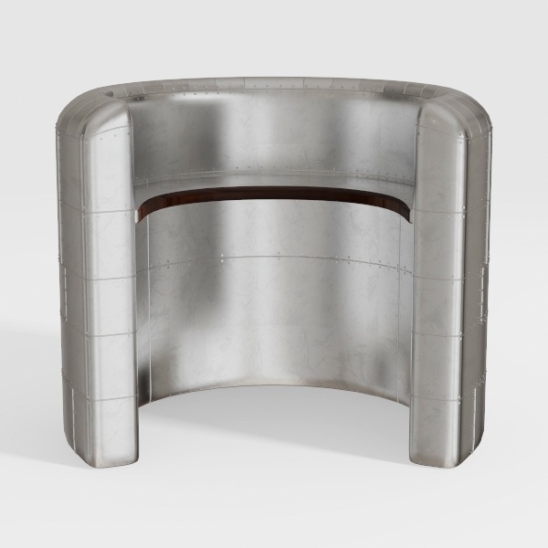 Inspired by industrial aviation aesthetics, this curved furniture piece features a sleek, matte silver metal surface with distinct rivet details, creating a striking contrast between cool industrial tones and a warm, dark wooden center strip. Its curved form exudes strength and modern sophistication, perfect for modern industrial or loft-style spaces, pairing beautifully with dark wood floors and black metal accents. The wide, supportive seat and contoured back ensure both style and comfort for extended relaxation.