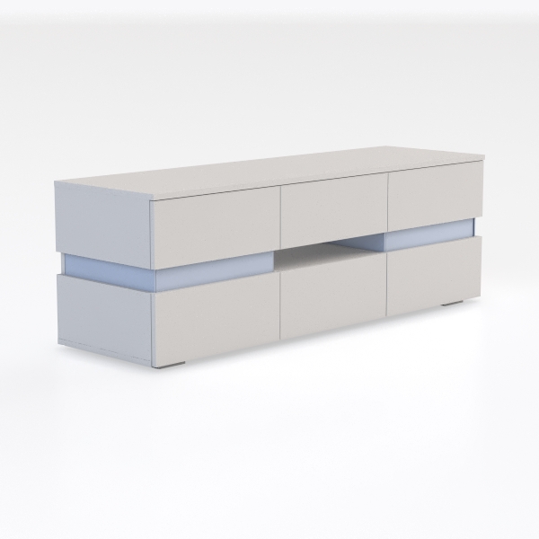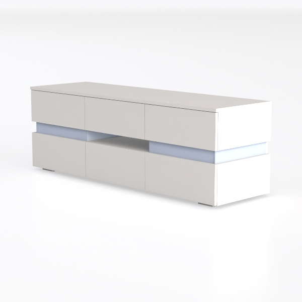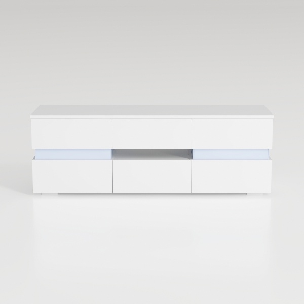 Crafted with minimalist principles, drawing inspiration from clean lines and functional space optimization, this cabinet features a sleek, matte white surface offering a smooth, cool touch. Crisp contrasts between solid drawers and open central shelving create visual depth. Ideal for modern, Scandinavian, or minimalist living rooms, pairing beautifully with wooden accents and soft lighting, it has six integrated drawers for ample storage and a central open space to accommodate media devices, keeping the area clutter-free and elegant.